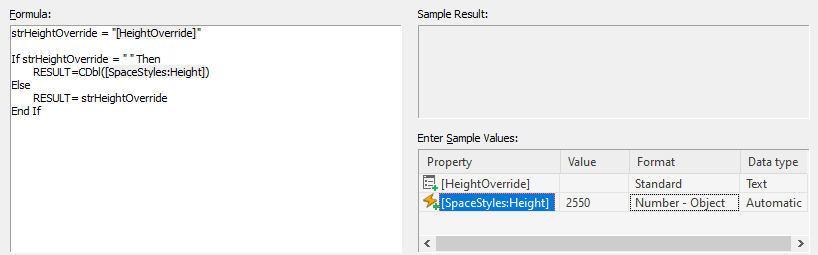 Sample values are formatted and inserted into the formula in place of the corresponding property definition names with brackets surrounding them. The entire sample formula is evaluated, and the result displays in the Sample Result pane.