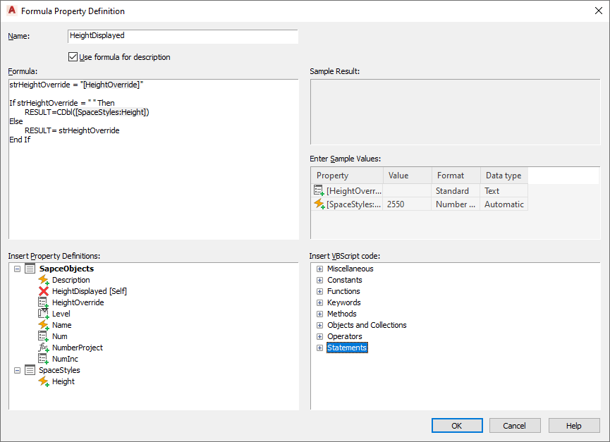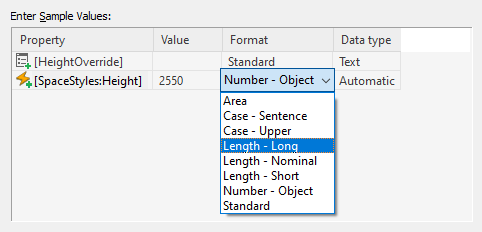 When a property definition is first inserted in a formula, its sample value is taken from an object in the current drawing that uses the formula’s property set definition or from a default object.