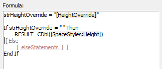 The space object has a single numeric value for its height, which is adequate for the majority of spaces in a room schedule. However, to get more control over how space heights are displayed for rooms without flat ceilings, you can create a formula that returns a text override, such as “Vaulted” for a cathedral ceiling, or return the actual height. The completed worksheet for such a formula is shown below.