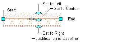 Six grips appear, with four indicating the justification options: Left Right, Center, and Baseline. The gray grip identifies the current justification. Start and End grips for the wall segment are also displayed.