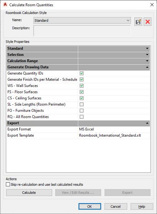 - In the Calculate Room Quantities dialog box, select the following options: