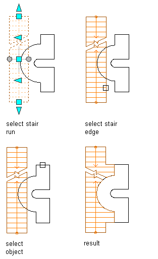 Use this procedure to project the side of a stair to an existing polyline, wall, other AEC object, or solid. Objects to project to must extend the full length of the stair for an interior corner to project properly.