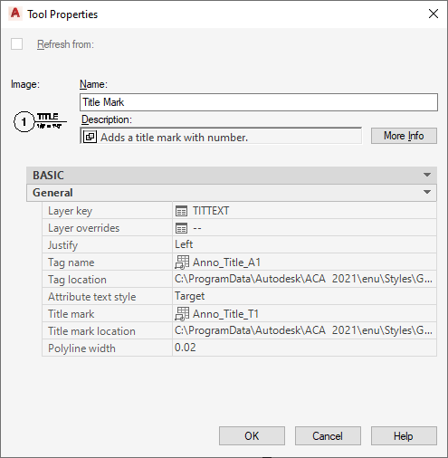 | Name | General | Sets a default name for model space views that are created by this tool. You can override the name set in the tool when inserting a callout in the drawing. |