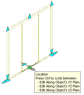 In Model view, the Location grip has three possible edit modes: Edit Along Object’s XY Plane, Edit Along Object’s YZ Plane, and Edit Along Object’s XZ Plane. Press Ctrl to cycle between modes until you are in the desired mode. The default edit mode is along the XY plane. In Plan view, the Location grip is restricted to movement in one plane.