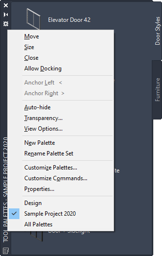3. In the title bar of the tool palettes set, click , and then select the project tool palette group.