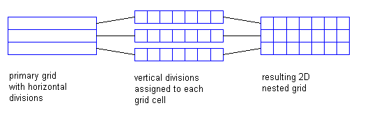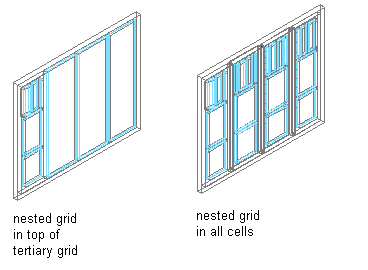 When you nest grids, you start with one primary grid. Each cell in the primary grid can then be filled with another grid. For example, if your primary grid is horizontal and has three cells, you can nest a vertical grid in each horizontal cell to create a simple two-dimensional (2D) grid. This is the nesting configuration for the Standard curtain wall style.