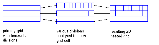 The previous illustration shows all cells in the grid with the same cell assignment—a vertical division. However, each cell in a grid is independent and can have a separate assignment. For example, the following illustration shows a three cell horizontal grid with different assignments in each cell. The bottom cell contains another horizontal division, the middle cell contains vertical divisions of varying width, and the top cell contains a vertical divisions of a fixed width.