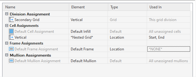 You can define nested grids by using the Design Rules tab of the Curtain Wall Style Properties dialog box. The tree in the left pane lists the grids. There is always one primary grid. The primary grid can have one or more secondary grids. Each secondary grid can have one or more tertiary grids, and so on.