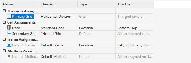 Each grid has its own cell assignments. You assign cells to contain another grid, a panel infill, or an object such as a door or window.