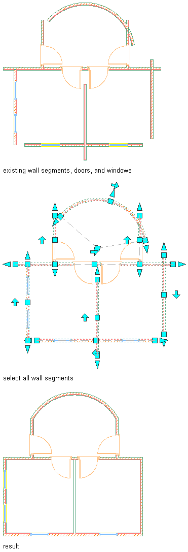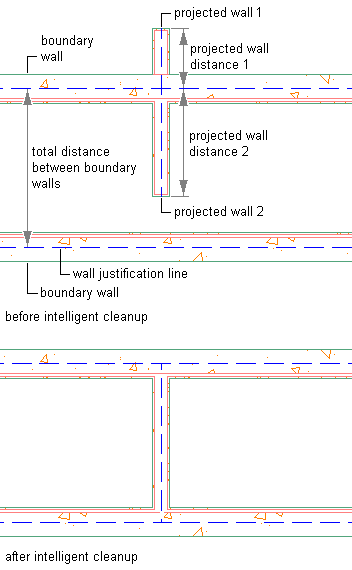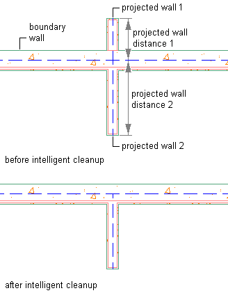 When cleaning up multiple wall intersections, projected walls are trimmed or extended to adjacent walls that can act as boundary walls. Only selected wall segments participate in cleanup.