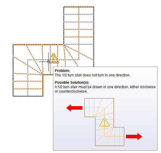 When AutoCAD Architecture 2027 toolset detects a problem with the way a stair object is drawn, it displays a solution tip icon on the stair in the drawing.