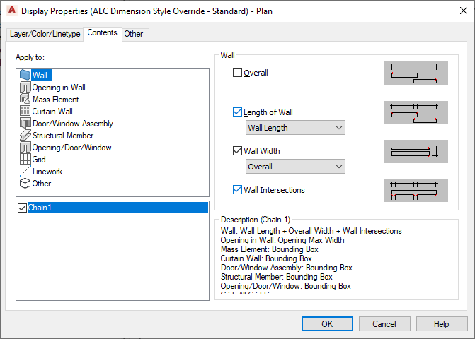 Below the Apply To list, you find the list of available chains in this AEC dimension style.