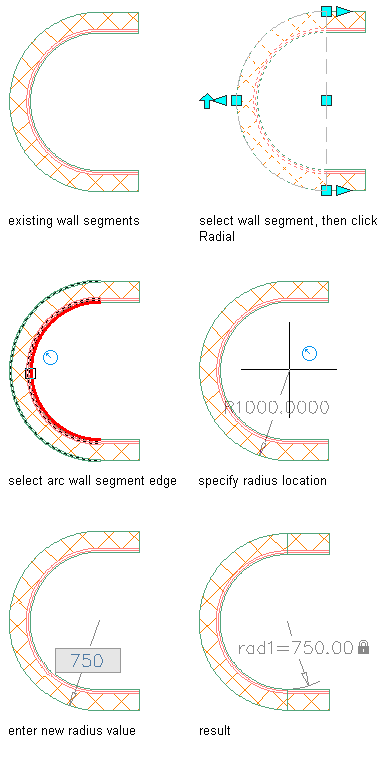 The Radial constraint maintains a specific radius of an AEC object. The Radial constraint also works between appropriate AEC objects and AutoCAD objects, such as a wall segment and a line.