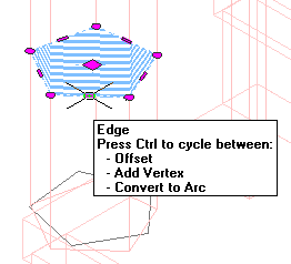 | use grips to edit the profile | move the edge or vertex grips as needed. The Edge grip has three edit modes: Offset, Add Vertex, and Convert to Arc. The default mode is Offset, which offsets the selected edge in a direction that is perpendicular to the midpoint of the edge. Depending on the shape of the profile and the edge you choose to modify, neighboring lines are extended or trimmed, and new lines are added as necessary. Use the Add Vertex edit mode to add a vertex to the selected edge, and create a new edge. If the selected edge is an arc, the new edge is an arc as well. Convert to Arc changes the selected edge to an arc and stretches the midpoint of the edge. The edge grip for an arc also has a Stretch mode, so that you can stretch the midpoint of the edge after it has been converted to an arc. |