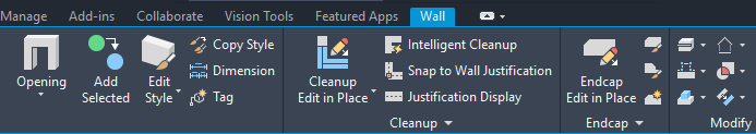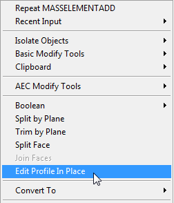 • On the contextual tab of the object on the ribbon, select the Edit in Place command. Depending on the object, the edit in place command can be located in different panels. Also, some objects like walls or curtain walls can have multiple profile-based components. In this case, first select the appropriate panel for the component, and then the associated Edit in Place command.
