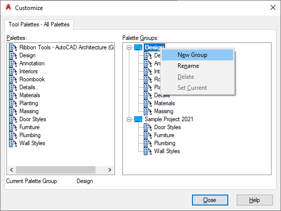 - Select a tool palette from the left pane for the new tool palettes group, and drag it into the new group folder.