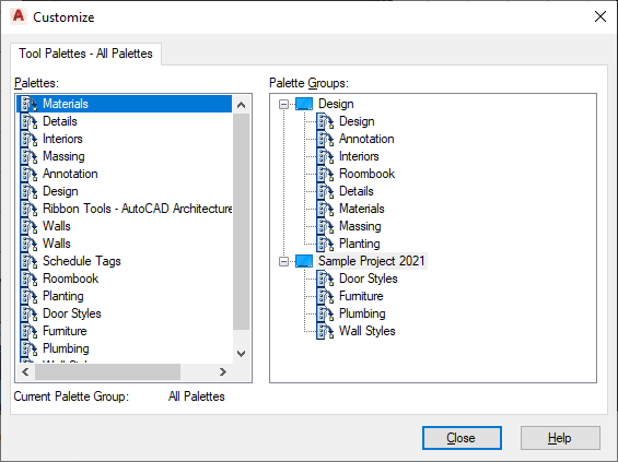 If an empty tool palette group is created for a project, it is not displayed in the tool palettes set after the project is set current. To display it, add at least one tool palette.