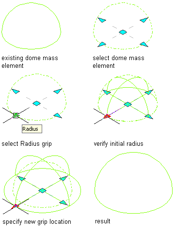 Use this procedure to change the radius of a circular mass element using grips. Circular mass elements include Cones, Cylinders, Domes, Doric Columns, Spheres, and Revolutions.