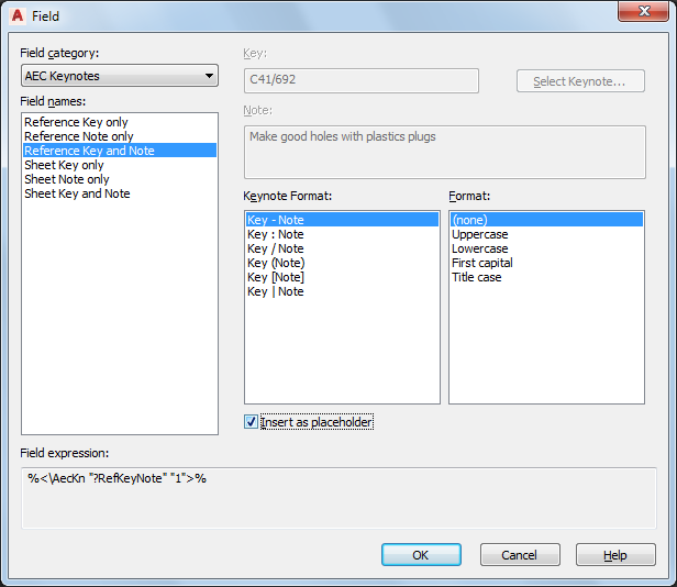 3. In the Field dialog box, make sure the current Field category is AEC Keynotes, and then select a keynote format under Field names. If one of the key-and-note options is selected, you can select an option under Keynote Format. You can also change the setting under Format, if desired.