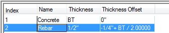 However, if you want the rebar to be positioned in the middle of the concrete component, regardless of its thickness, you can configure the components as follows, where the concrete thickness is specified as a variable (BT), and the offset of the rebar component is specified as one half of the concrete thickness, whatever that may be, minus half the thickness of the rebar (1/4'').