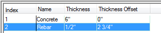For more complicated positioning relationships involving the Base Thickness variable, you can construct formulas for calculating the Thickness and Thickness Offset values. For example, if you know you want .5'' rebar to be positioned in the middle of a concrete layer with a fixed thickness of 6'', you might configure the components in the slab style as follows:
