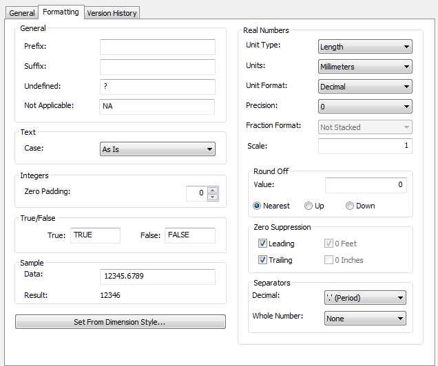 You can specify different data formats for the same property in property set definitions, schedule table styles, and schedule tags. This enables you to display the same value differently in different contexts. For example, you may want to use a data format with greater precision for real numbers in a property set, and display fewer digits in a schedule table.