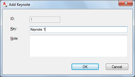 . The Add Keynote dialog box is displayed with the read-only ID field showing the database identifier for the keynote you are adding.