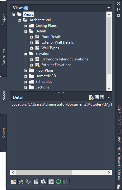 The Views tab of the Project Navigator palette is where you create individual views of your building data. Views contain constructs and are the primary location for adding annotation like notes, tags, and dimensions within the project. After you have created a view drawing, you can create model space views in it.