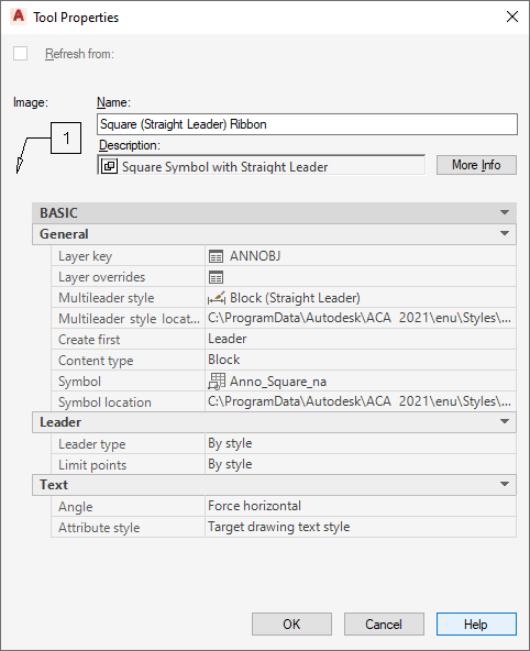 | General/Symbol | Displayed only if Content type is Block, this property specifies the block-based symbol to be used for the annotation. For sheet keynotes, the block contains an automatically updatable field value that determines keynote format and either specifies a particular keynote or serves as a placeholder. The placeholder value is then replaced by whatever keynote is associated with the selected object or component or by a keynote selected manually during the insertion process. |
