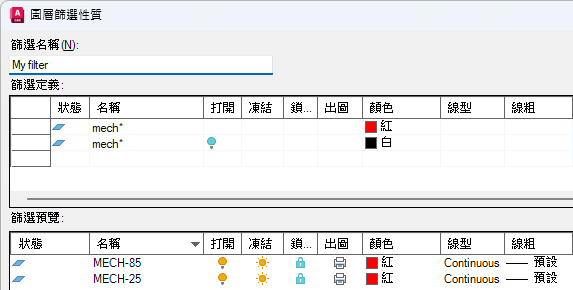 在此範例中,圖層性質篩選包含以「mech」開頭的紅色圖層,或以「mech」開頭的白色關閉圖層。