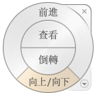 按下並拖曳操控盤的楔形塊按鈕是主要的互動模式。顯示操控盤後,按一下其中一個楔形塊按鈕,然後按住指向設備上的按鈕以啟用導覽工具。拖曳以重新定位目前的視圖。釋放按鈕會使您返回操控盤。