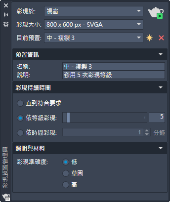 - 依時間彩現。 指定彩現引擎用來反覆精細化彩現影像的分鐘數。(RENDERTIME 系統變數)