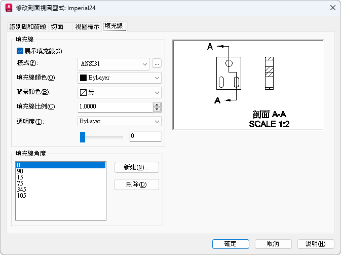 - 設定用於剖面視圖內所有填充線的填充線樣式。