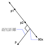 決定點 p 到線 (通過點 p1 和 p2) 的最短距離。
