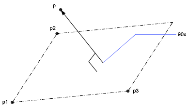 決定點 p 到經由三點 (p1,p2,p3) 定義的平面之距離。