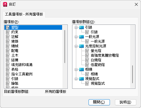 「工具選項板」視窗會顯示所有可用的工具選項板,讓您建立和管理工具選項板群組。