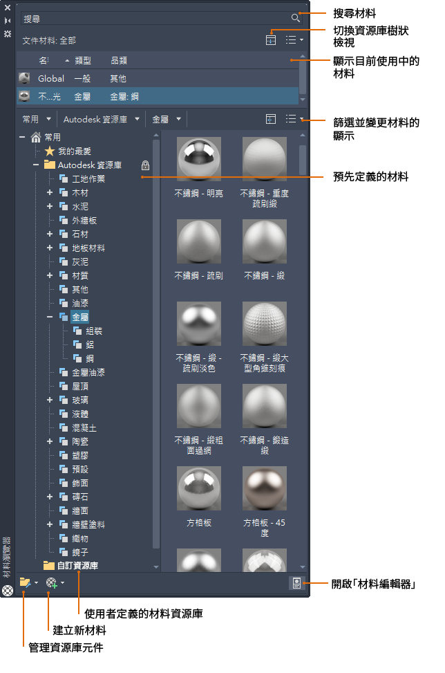 - Autodesk 資源庫。包含預先定義材料,適用於支援該材料的 Autodesk 應用程式。雖然您無法編輯 Autodesk 資源庫,但可以將這些材料當做自訂材料的基礎,然後再儲存於使用者資源庫。