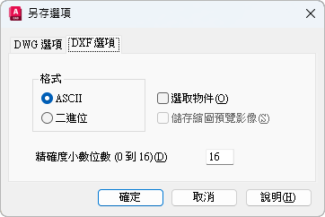 指定是否建立 ASCII 或二進位 DXF 檔。ASCII 格式的 DXF 檔案可在文字編輯器中讀取,並與一般的應用程式相容。二進位格式的 DXF 檔比較精簡。二進位格式檔的讀寫作業比 ASCII 檔的讀寫作業還要快速。