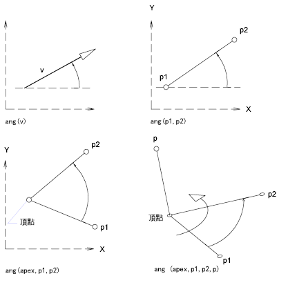 ang 函數決定兩條線之間的夾角。角度是根據 X 軸 (在 2D 的情況下),或是使用者指定的軸 (在 3D 的情況下) 按逆時鐘方向進行測量。