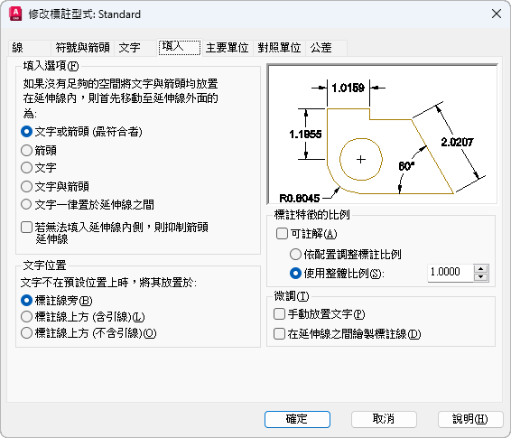 設定標註文字從預設位置 (標註型式所定義的位置) 移開時,所要放置的位置。(系統變數 DIMTMOVE)