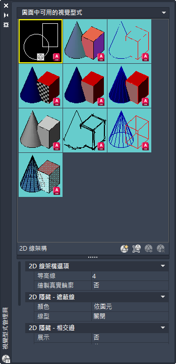 視覺型式管理員具有圖面中可用視覺型式的範例影像面板,及以下性質面板: