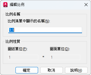 輸入描述性或數字名稱。例如,在使用典型英制比例的建築圖面中,您可以輸入 1"=4' 或 1:48。