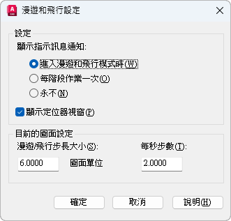 指定在每個 AutoCAD 階段作業中第一次進入漫遊或飛行模式時,顯示「漫遊和飛行導覽對映」訊息通知。