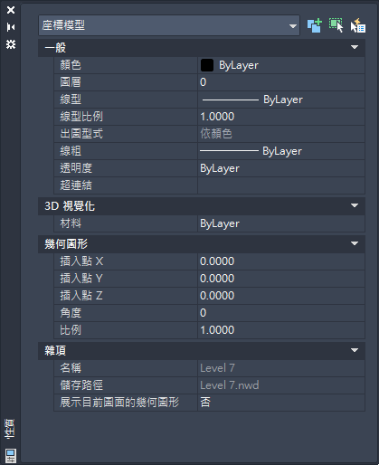當您在「性質」選項板上變更設定時,座標模型會即時更新。