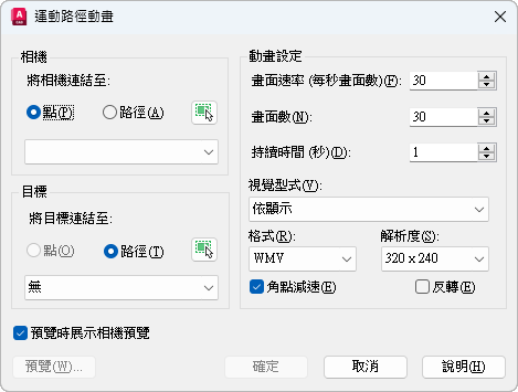 顯示視埠中相機移動的動畫。如果選取了「預覽時展示相機預覽」,則「動畫預覽」對話方塊也會顯示動畫的預覽。
