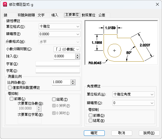 設定主要標註單位的格式和精確度,以及設定標註文字的字首和字尾。