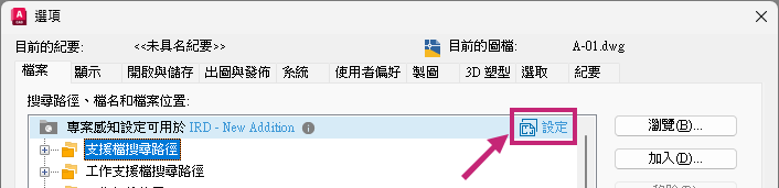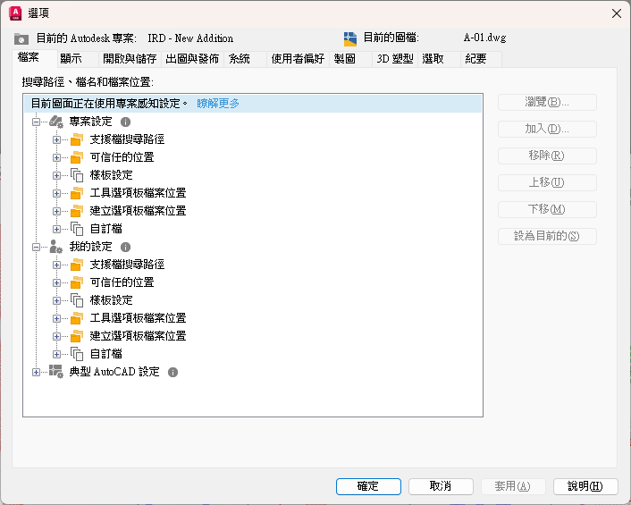 註: 如果看不到「設置」選項,則表示之前可能已規劃專案。如果出現「目前圖面正在使用專案感知設定」文字,即可得知。