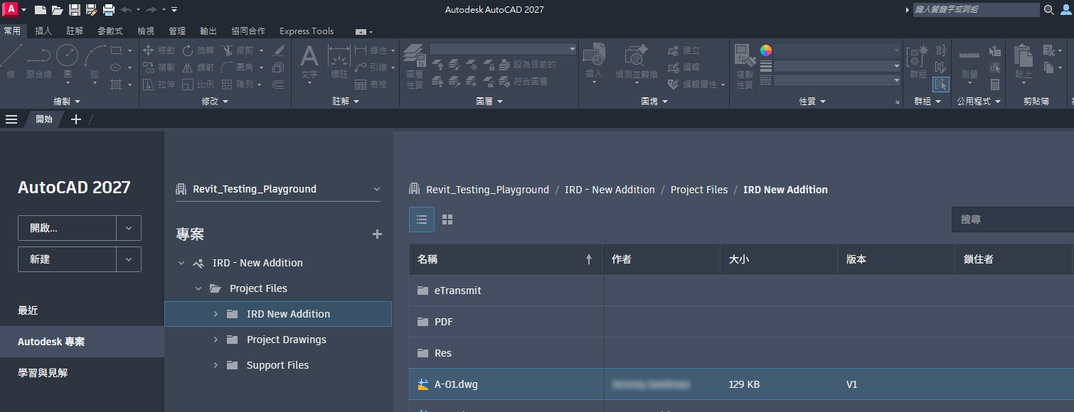 - 在 Desktop Connector 中選取初始專案後,請在 AutoCAD 的「開始」頁面上,按一下「Autodesk 專案」。