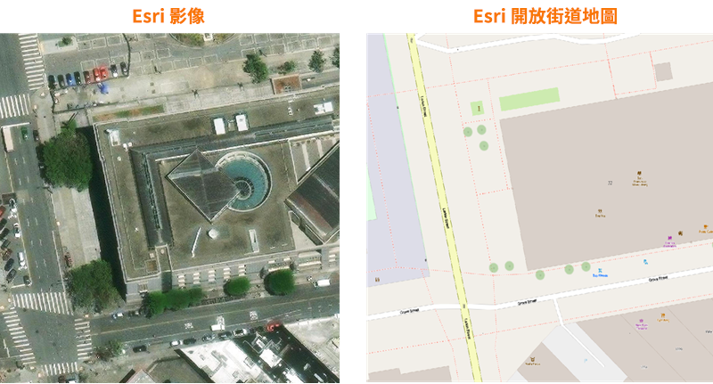 您可以將地圖顯示為衛星影像 (Esri 影像) 或向量影像 (Esri 開放街道地圖)。如果繪圖區分為多個視埠,則每個視埠均可具有不同型式的地圖。