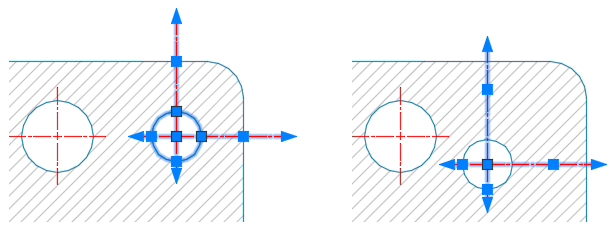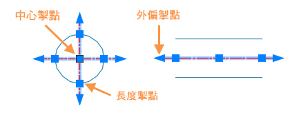 掣點允許直接操控中心標記與中心線。在此範例中,圓上的中心線會個別進行修改。當拖曳長度掣點時,它會調整中心線的長度,中心線延伸也會隨之移動。但拖曳外偏位量掣點時,只能控制中心線延伸。